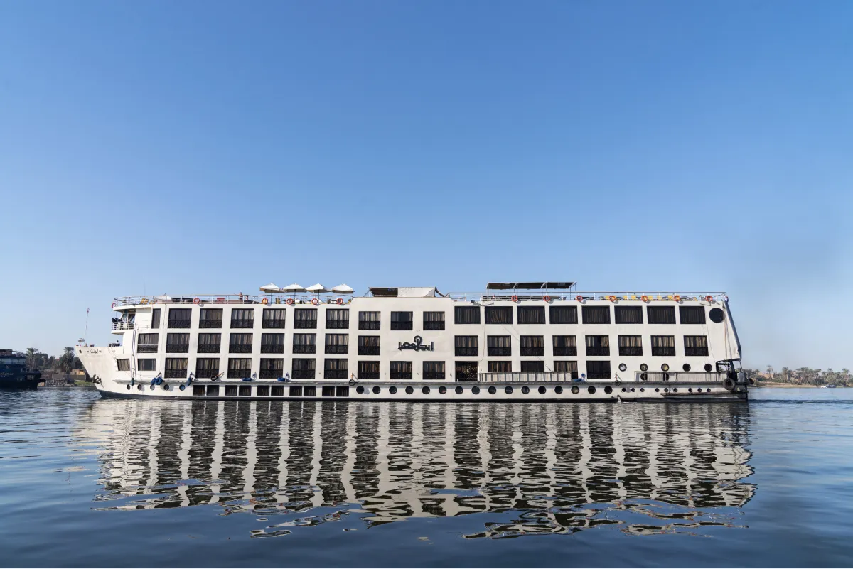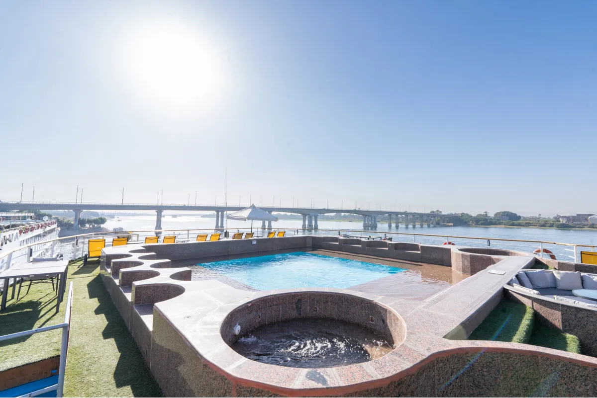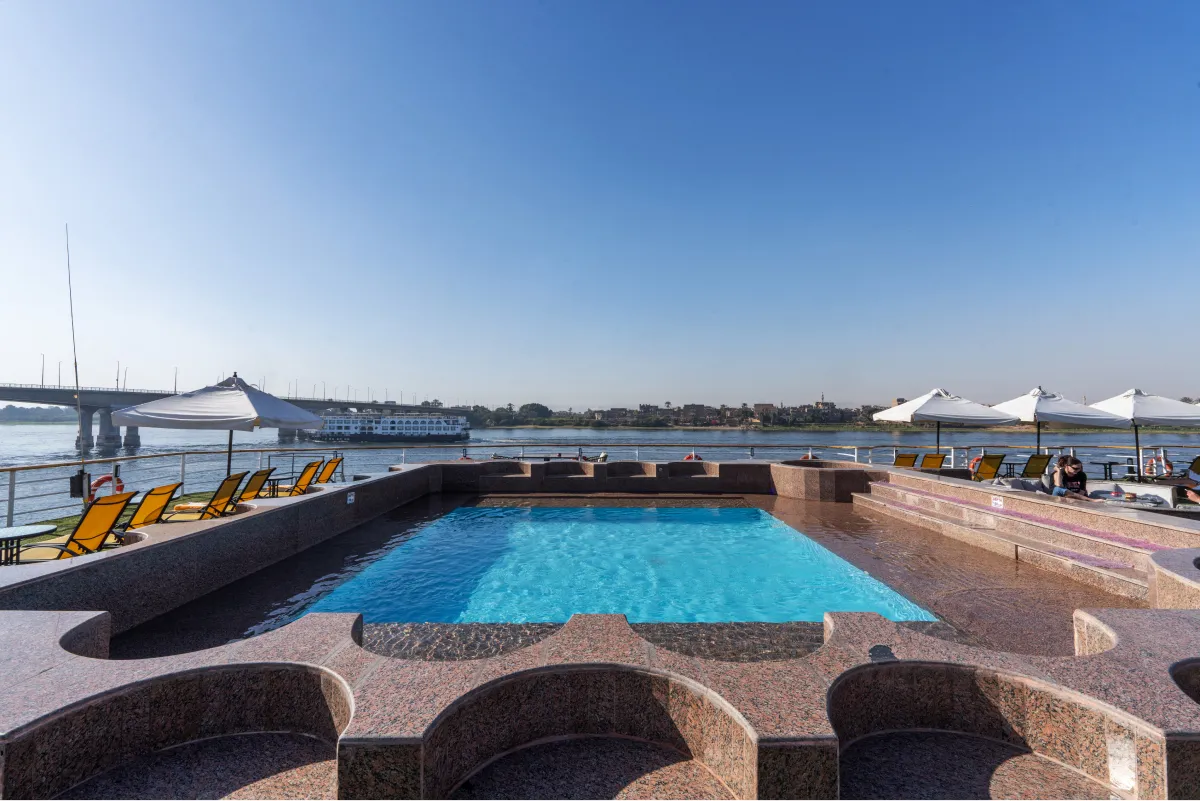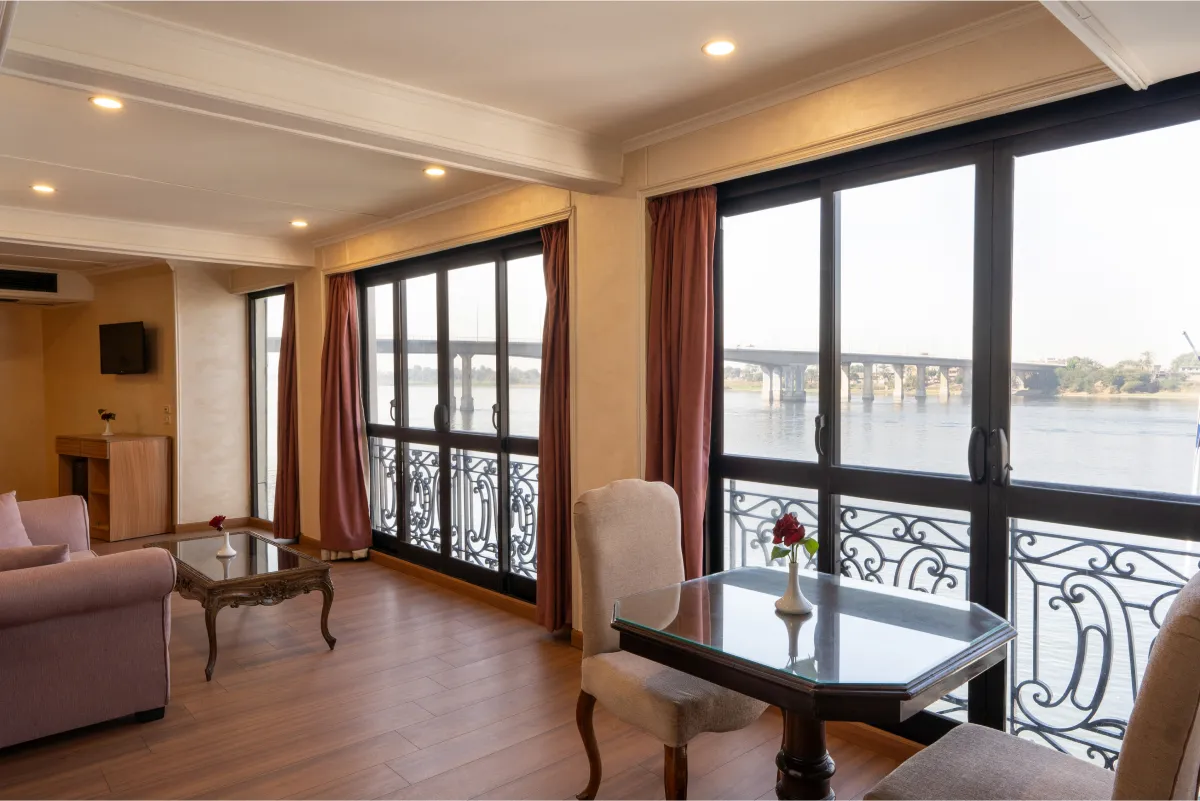 Unwind, explore temples, and witness the breathtaking landscape on the Nile Kleos. Our cruise includes a large lounge with a bar, a sundeck with a swimming pool, a one-setting restaurant, a bazaar, and a jewelry shop. Whether you want to sip a cocktail, soak up the sun, savor a delicious meal, or shop for souvenirs, you will find everything you need on board. If you are looking for a relaxing and luxurious getaway on the Nile, look no further than our 67 cabins. Each cabin is equipped with excellent amenities and a French balcony that offers a splendid view of the river.