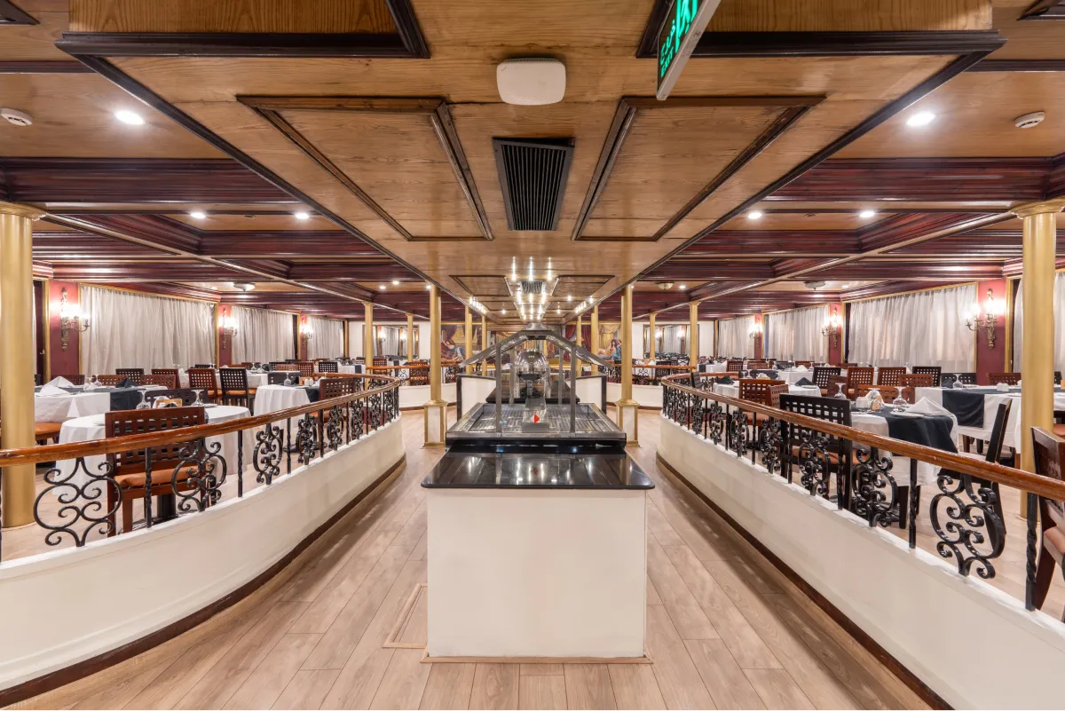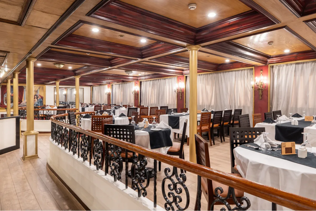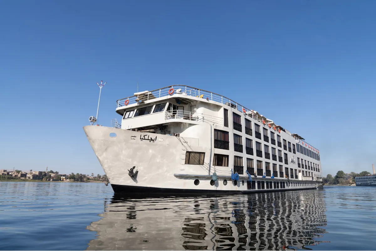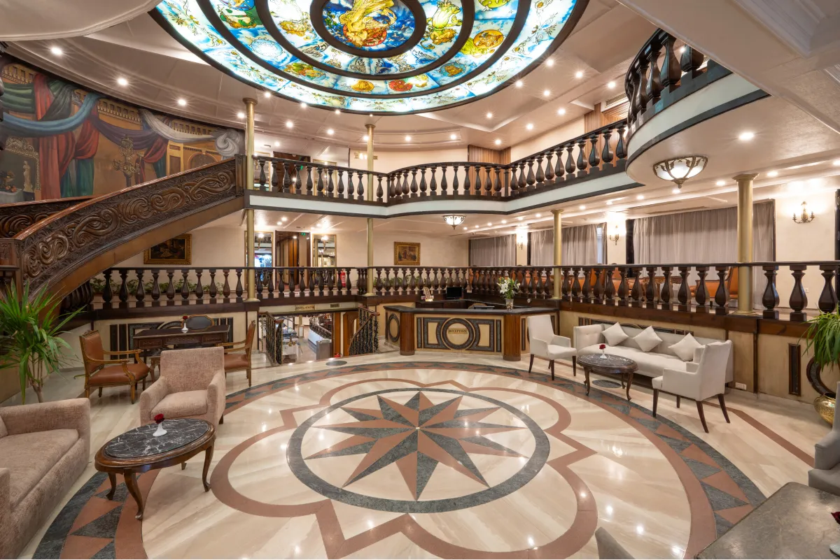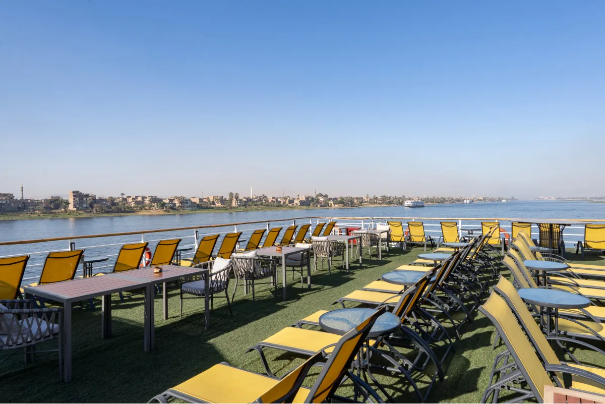 Unwind, explore temples, and witness the breathtaking landscape on the Nile Kleos. Our cruise includes a large lounge with a bar, a sundeck with a swimming pool, a one-setting restaurant, a bazaar, and a jewelry shop. Whether you want to sip a cocktail, soak up the sun, savor a delicious meal, or shop for souvenirs, you will find everything you need on board. If you are looking for a relaxing and luxurious getaway on the Nile, look no further than our 67 cabins. Each cabin is equipped with excellent amenities and a French balcony that offers a splendid view of the river.