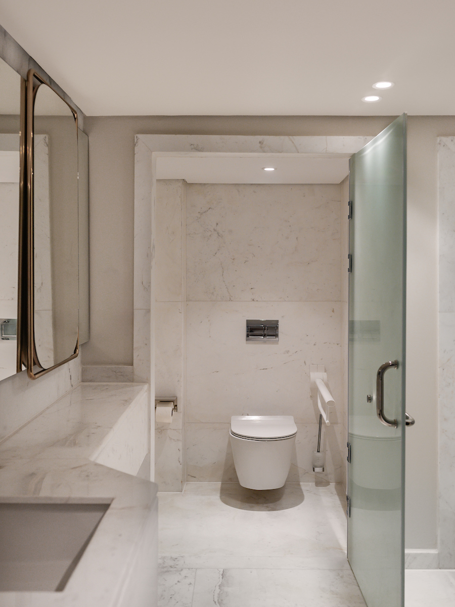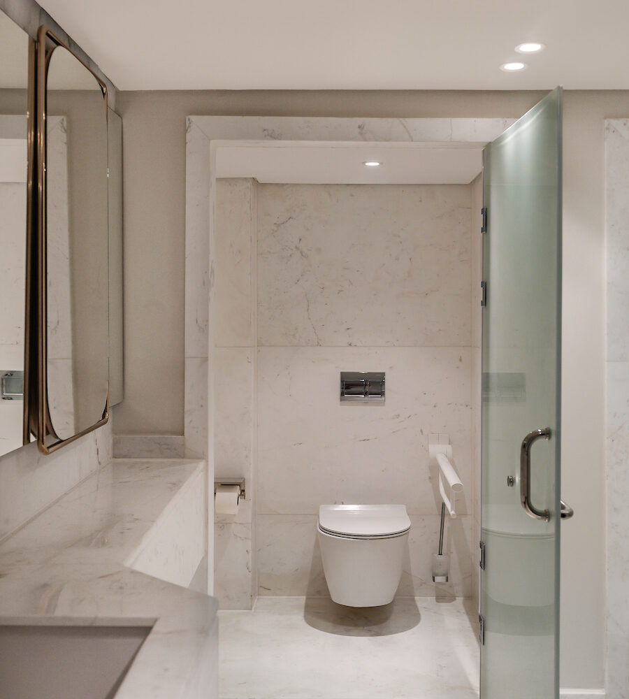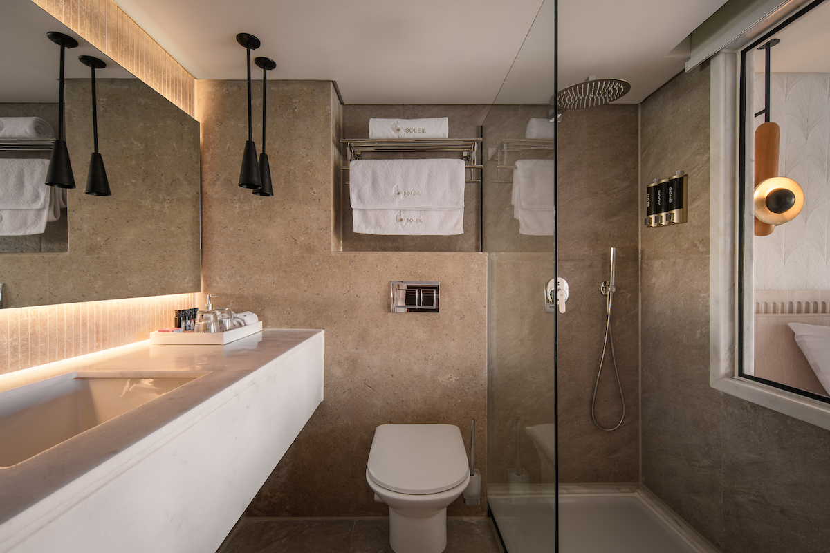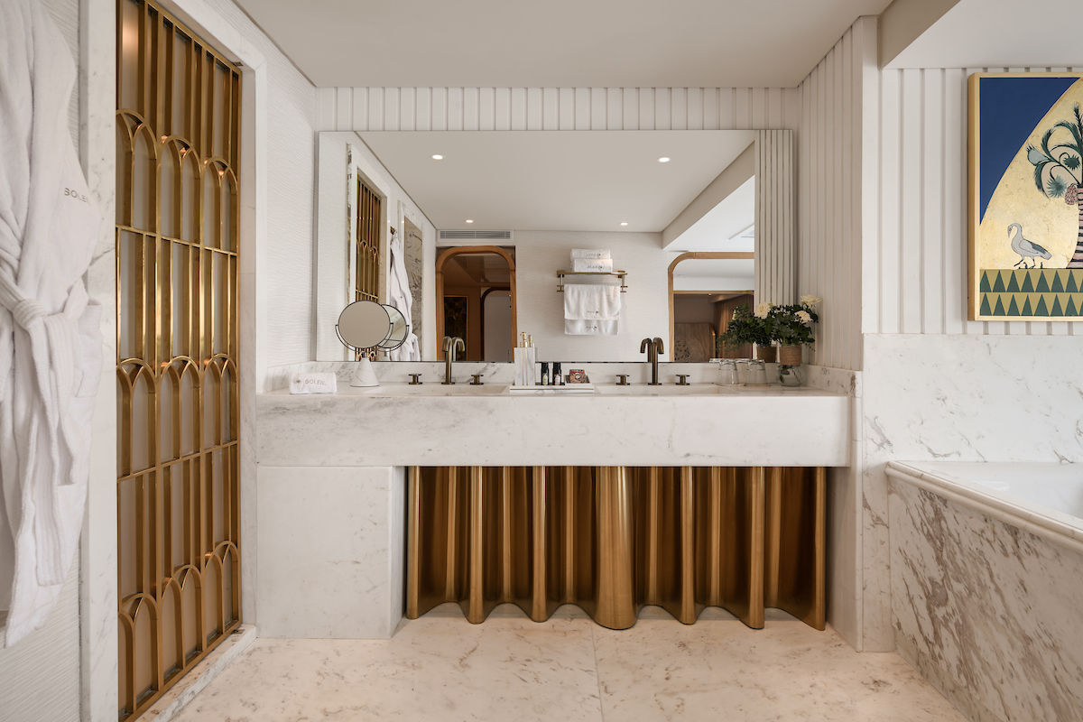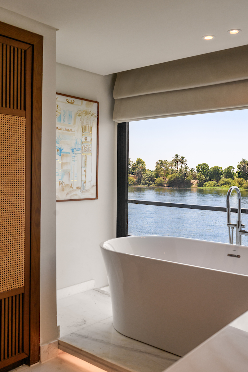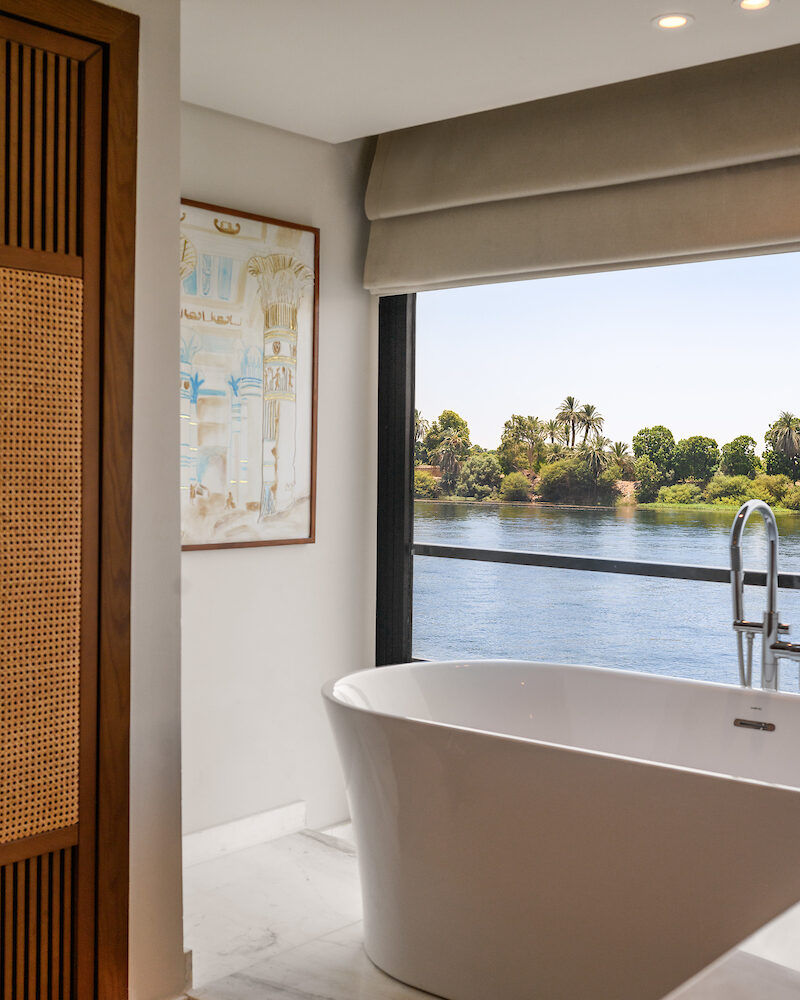 – A separate large bathroom with large mirror with light and two separate sinks, separate toilet and separate shower, and a bathtub overlooking stunning views of the Nile.