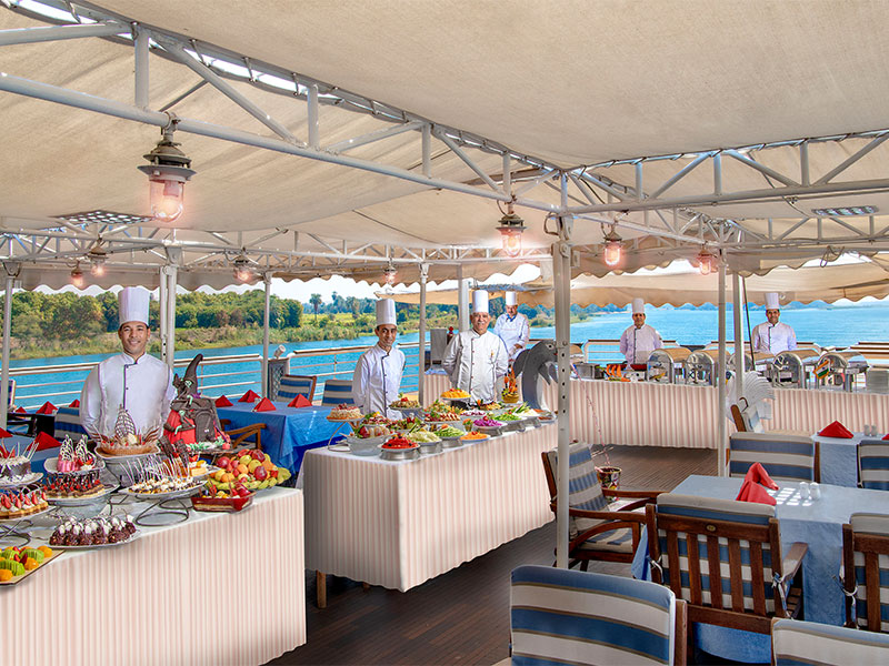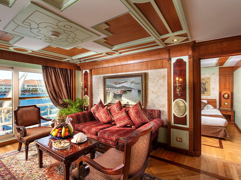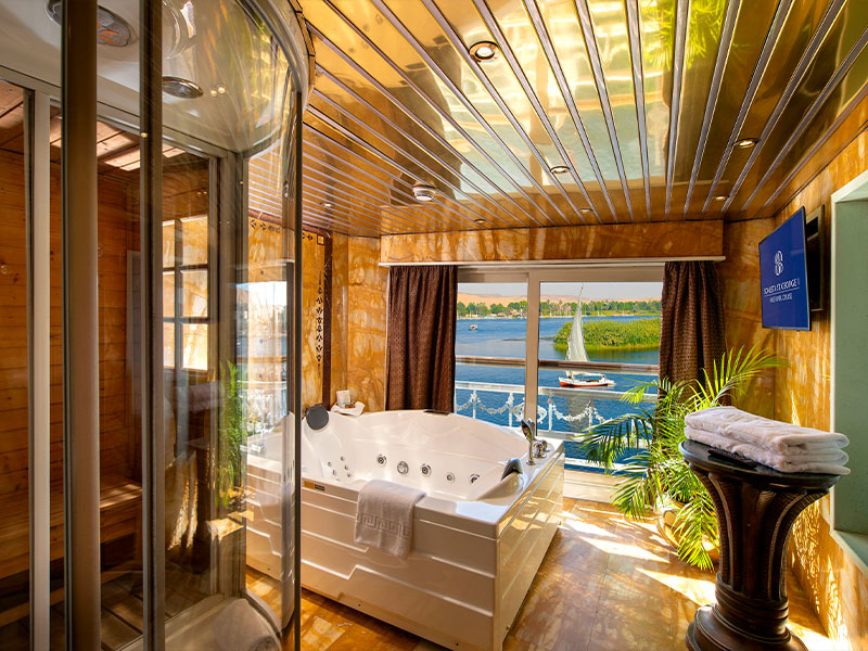 -LED 43 inches TV, equipped with the latest technology and featuring a live sailing channel. – Double-glass panoramic french windows that open to bring in fresh breezes from the Nile. – Complimentary Wireless internet access is available. – Direct-dial telephone. – Individual climate control. – Electronic door locks. – Mini-bar – Safe – Hair dryer – Bathrooms equipped with spa unit; including steam bath, Jacuzzi and water massage.